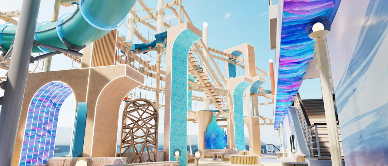 The Drop, is the signature dry slide that rushes guests down 10 decks – from deck 18 to eight