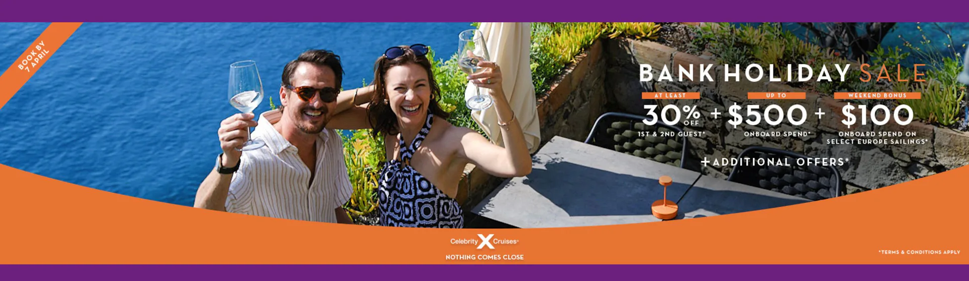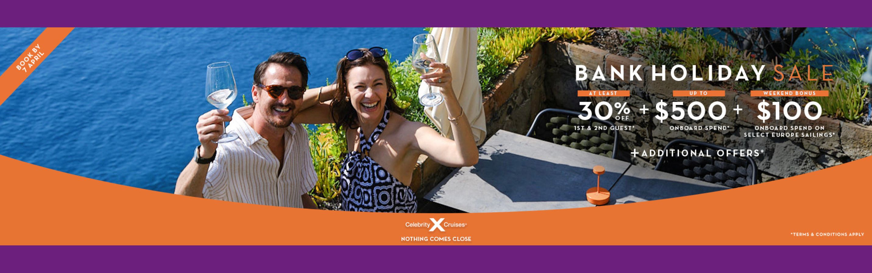 Make the most of the Bank Holiday with exceptional savings on Celebrity Cruises. Enjoy at least 30% off the first and second guest, plus up to $500 onboard credit, with an extra $100 onboard credit on selected Europe sailings when you book by 7 April.