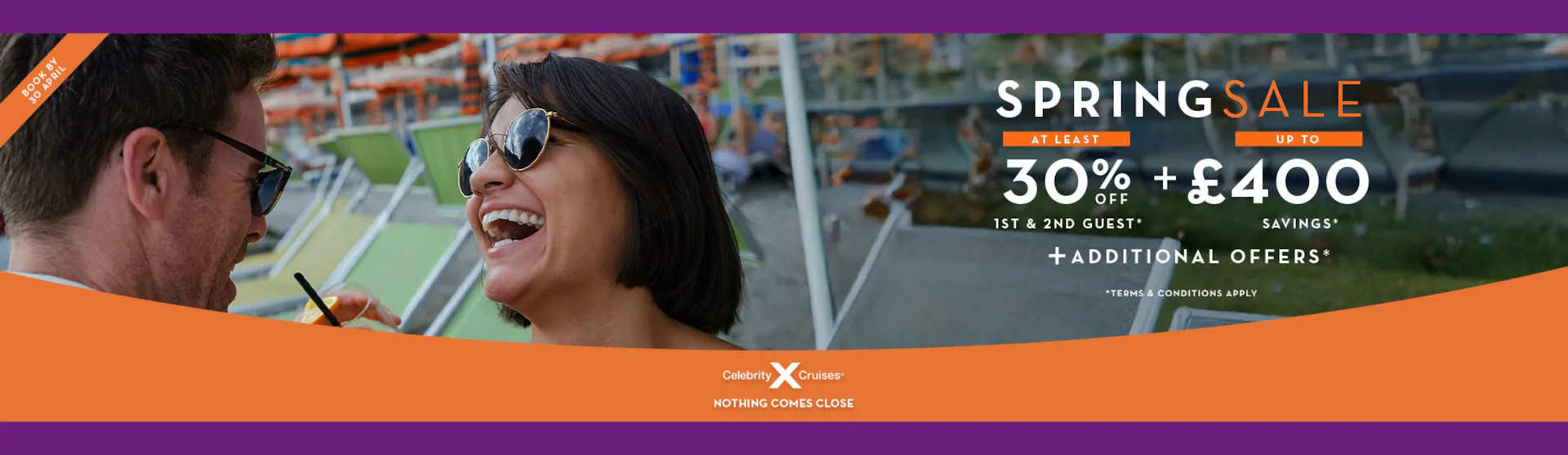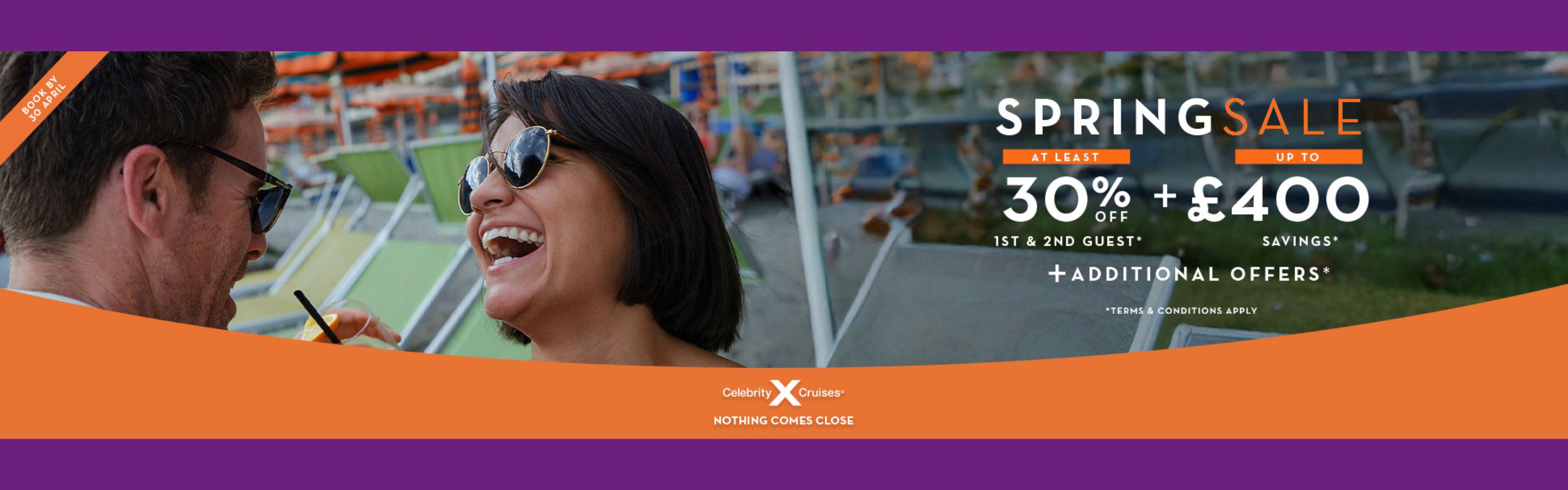 Make the most of the Spring with exceptional savings on Celebrity Cruises. Enjoy at least 30% off the first and second guest, plus up to £400 in extra savings, when you book by 30 April.