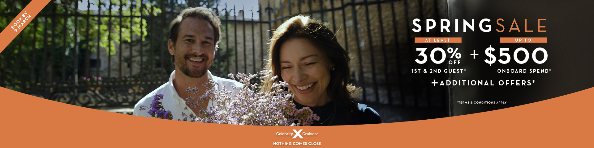 With the Celebrity Cruises Spring Sale, you can enjoy exceptional value on your next holiday. Receive up to $500 onboard spend and save at least 30% on the first and second guest. What's more, you can add more value to your cruise by upgrading to the "All-Included" fare to include a Classic Drinks Package, and a Wi-Fi package at a discounted price.