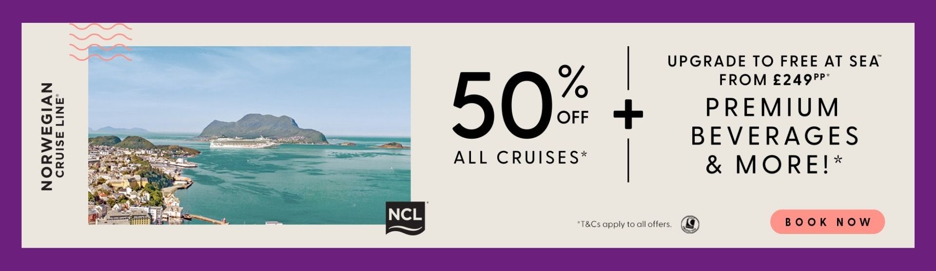 Enjoy 50% off Norwegian Cruise Line holidays, with the option to add Free at Sea for premium drinks and extra perks.