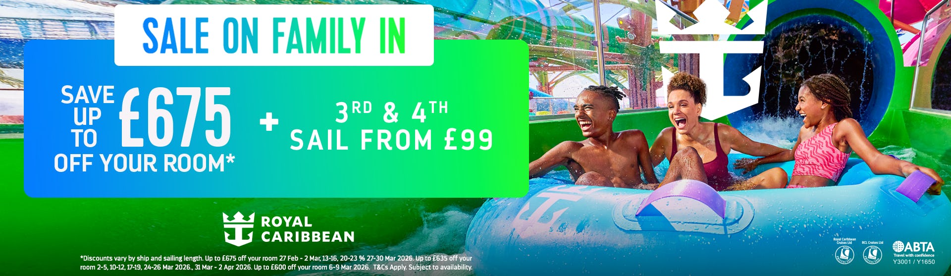 Offer excludes sailings: Thanksgiving Sailings ( (Departing between November 19 – November 27, 2026),(Departing between November 18 – November 26, 2027), Holiday Sailings; (Departing between December 17, 2026 – January 4, 2027), (Departing between December 16, 2027 – January 5, 2028), Chinese New Year sailing on Ovation of the Seas (Departing February 15– February 18, 2026), Chinese New Year sailing on Navigator of the Seas (Departing February 4 – February 8, 2027), Spring Break Sailing (Departing between March 6 – April 9, 2026); (Departing between March 5 – April 4, 2027), (Departing between March 3 – March 31, 2028), Easter Sailing (Departing between April 7 – April 17, 2028) Alaska Cruise Tour Sailings (Departing between May 15 – September 11, 2026), (Departing between May 14 – September 17, 2027), Summer sailings (Departing between May 21 – August 25, 2026) excluding Harmony of the Seas sailing July 26, 2026; (Departing between May 28 – August 20, 2027). Please ensure that before booking this offer you have received any required permission to take your child out of school during term time. UK and other laws impose fines for taking children on holidays during term time without their school’s permission.