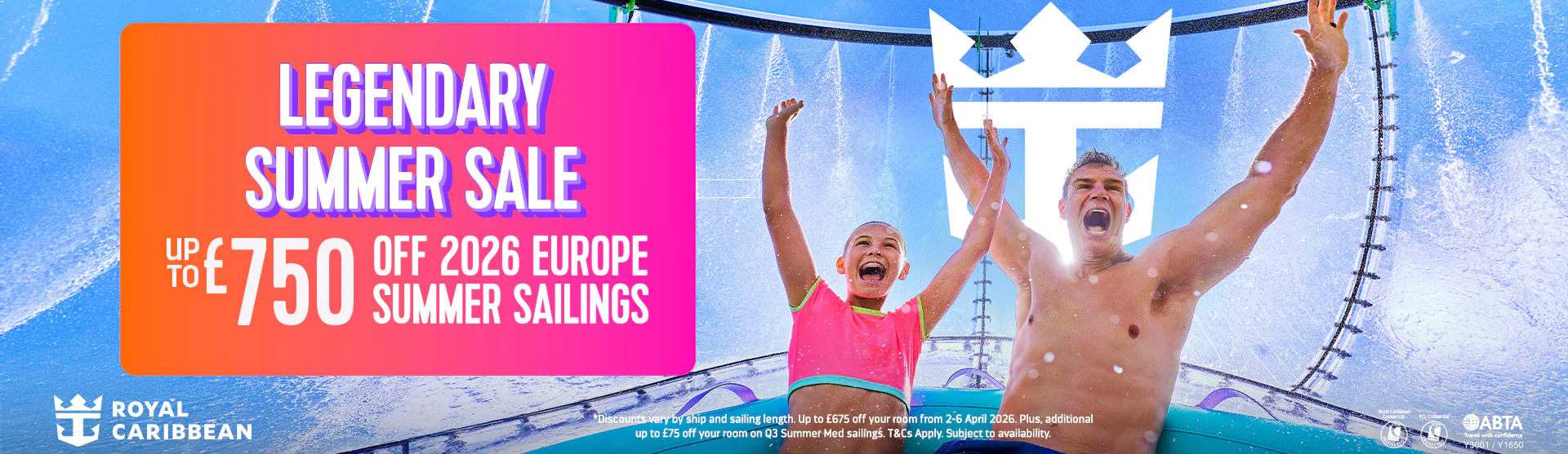 Offer excludes sailings: Thanksgiving Sailings ( (Departing between November 19 – November 27, 2026), (Departing between November 18 – November 26, 2027), Holiday Sailings; (Departing between December 17, 2026 – January 4, 2027), (Departing between December 16, 2027 – January 5, 2028), Chinese New Year sailing on Ovation of the Seas (Departing February 15– February 18, 2026), Chinese New Year sailing on Navigator of the Seas (Departing February 4 – February 8, 2027), Spring Break Sailing (Departing between March 6 – April 9, 2026); (Departing between March 5 – April 4, 2027), (Departing between March 3 – March 31, 2028), Easter Sailing (Departing between April 7 – April 17, 2028) Alaska Cruise Tour Sailings (Departing between May 15 – September 11, 2026), (Departing between May 14 – September 17, 2027), Summer sailings (Departing between May 21 – August 25, 2026) excluding Harmony of the Seas sailing July 26, 2026; (Departing between May 28 – August 20, 2027). Please ensure that before booking this offer you have received any required permission to take your child out of school during term time. UK and other laws impose fines for taking children on holidays during term time without their school’s permission.